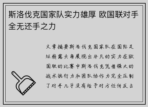 文章摘要:斯洛伐克国家队在国际足坛崭露头角,展现出非凡的实力。在欧国联的比赛中,斯洛伐克凭借强大的战术执行力和团队协作力,完全压制了对手,几乎没有给予对方任何反击的机会。本文将从斯洛伐克国家队的球员素...