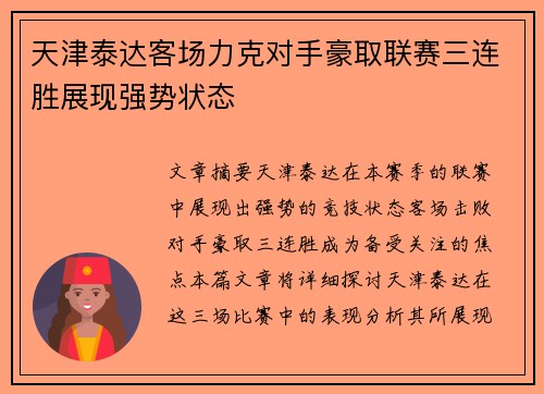 文章摘要:天津泰达在本赛季的联赛中展现出强势的竞技状态,客场击败对手,豪取三连胜,成为备受关注的焦点。本篇文章将详细探讨天津泰达在这三场比赛中的表现,分析其所展现的强势状态。首先,从球队整体实力的提升方面进行分析,阐述球队战术调整和球员个人表现对球队胜利的重要作用;其次,探讨天津泰达在客场作战时展现出的心理素质和战术执行力;再次,分析球队在这三场比赛中的进攻效率与防守稳固性,以及如何保持优势;最后,回顾球队的整体联赛走势和对未来的展望。通过对天津泰达强势表现的深入剖析,本篇文章力求呈现球队在赛季中的优异表现,以及如何保持持续竞争力。