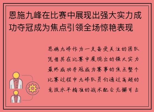 恩施九峰在比赛中展现出强大实力成功夺冠成为焦点引领全场惊艳表现